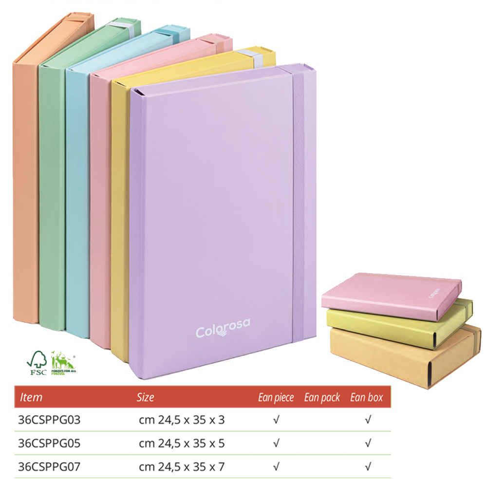 Portaprogetti di Colorosa con elastico, dorso rigido da 7 cm, ideali per organizzare i tuoi progetti in ufficio, ma anche a casa o a scuola. Il portaprogetti di Colorosa é realizzato in cartone rigido plastificato soft touch dry ecologico, certificato FSC®. Disponibile in 6 colori pastello con elastico tono su tono.