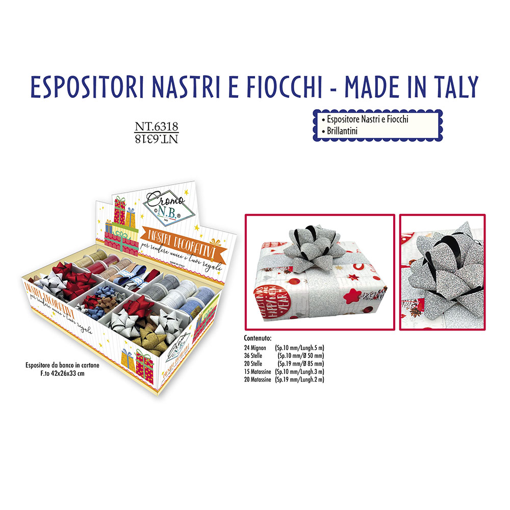 Espositore da banco in cartone Nastri e Fiocchi decorativi Brillantini di Cromo, colori assortiti.