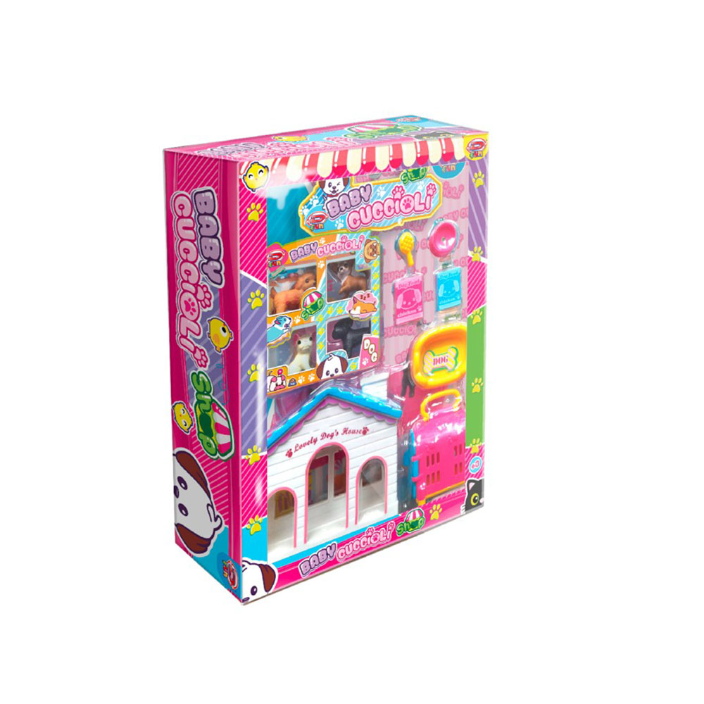 Il set include una casa per cani con varie figure di cuccioli e accessori come cucce, ciotole e altri oggetti per la cura degli animali.