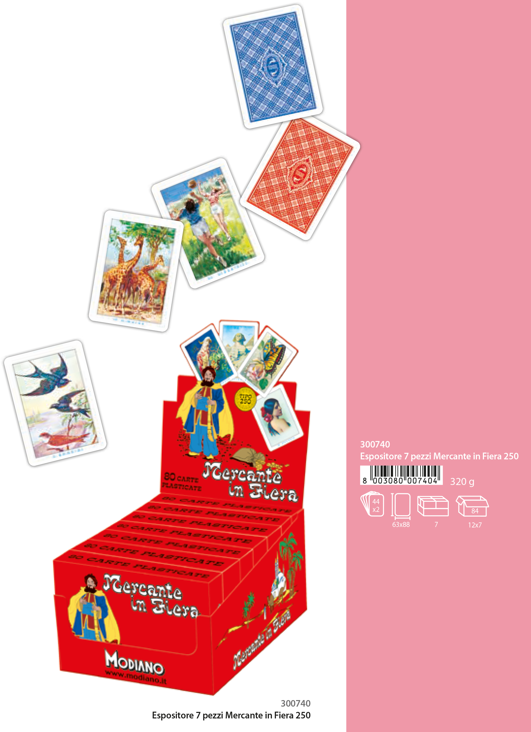 Espositore da banco Carte Mercante in Fiera, contiene 7 Set da 2 mazzi. Il Mercante in Fiera è uno dei giochi di società più diffusi e noti, adatto per adulti e per bambini. La confezione singola comprende 2 mazzi da 40 carte in cartoncino duplex plastificate e garantite da MODIANO.
